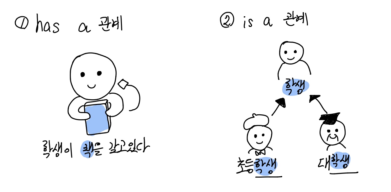 has a ๊ด๊ณ : ํ ๊ฐ์ฒด๊ฐ ๋ค๋ฅธ ๊ฐ์ฒด๋ฅผ ํฌํจํ๋ ๊ด๊ณ์ด๋ค. ํํ ์ฌ์ฉ๋๋ค.